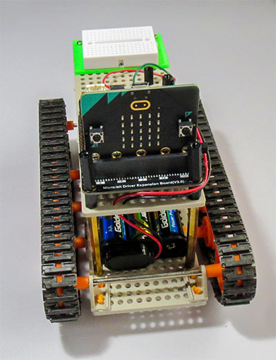 DCモーターが2つでキャタピラを制御します。超音波距離センサーが搭載されていますので自動停止機能を学習します。
